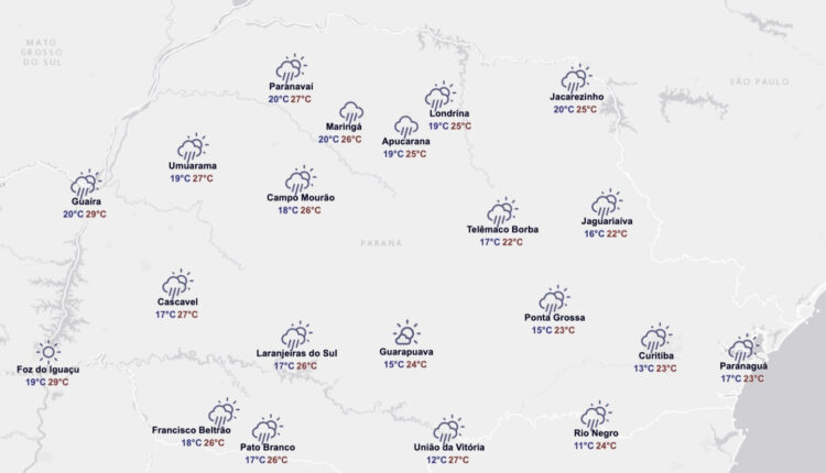 Apesar da chuva, as temperaturas permanecem elevadas, chegando perto dos 30°C no Oeste do Estado, especialmente em cidades como Altônia, Santa Helena e Foz do Iguaçu. Já no Leste, os valores são mais amenos, em torno dos 22°C.