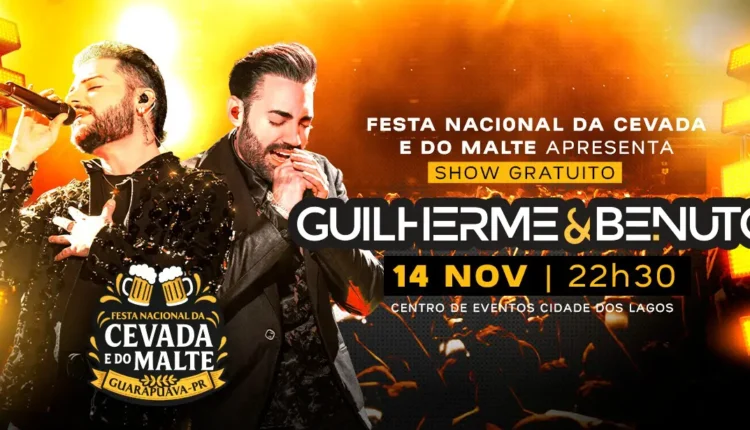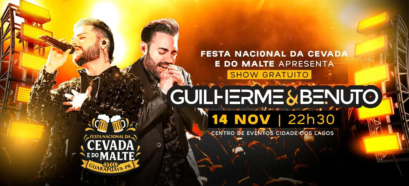A Prefeitura de Guarapuava anuncia a grande atração para a Festa da Cevada 2025. No dia 14 de novembro, o público guarapuavano e visitantes da região poderão curtir o show nacional de Guilherme e Benuto, um dos momentos mais esperados do evento.