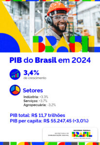 O Produto Interno Bruto (PIB) brasileiro cresceu 3,4% em 2024 em relação a 2023, e totalizou R$ 11,7 trilhões. De acordo com os dados do Instituto Brasileiro de Geografia e Estatística (IBGE) divulgados nesta sexta-feira, 7 de março, o PIB per capita chegou a R$ 55.247,45, com avanço real de 3% frente ao ano anterior. O índice mede a soma de todos os bens e serviços produzidos por um país.