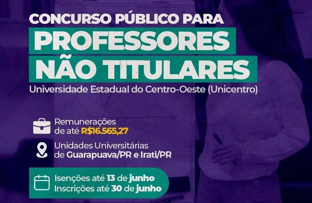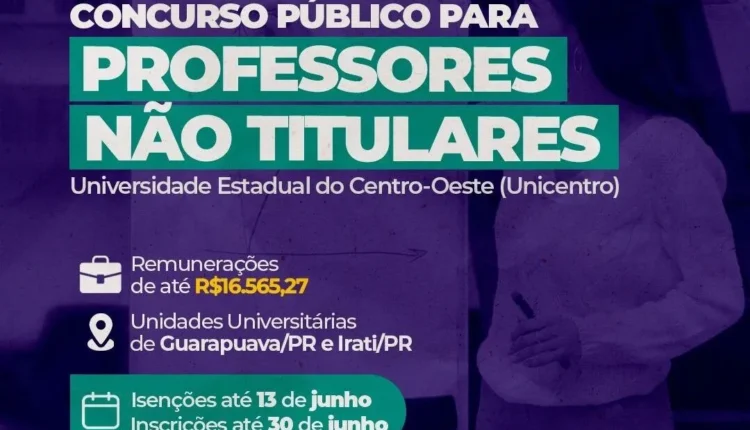 Terminam, nesta segunda-feira (30), as inscrições para o concurso público da Universidade Estadual do Centro-Oeste (Unicentro) voltado à contratação de professores não titulares. Ao todo, são ofertadas 38 vagas, distribuídas entre os câmpus de Guarapuava e Irati. Os salários variam de R$ 2.813,86 a R$ 16.565,27.