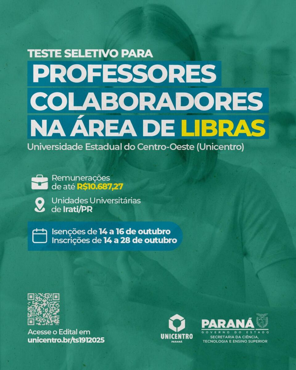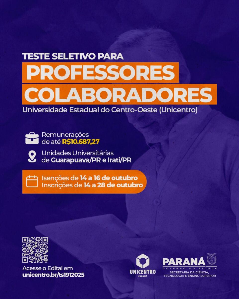 O prazo para as inscrições no teste seletivo de professores colaboradores da Universidade Estadual do Centro-Oeste (Unicentro) entrou na reta final. As vagas abrangem as áreas de Saúde, Ciências Agrárias e Ambientais, Ciências Exatas, Humanas e Sociais Aplicadas, com oportunidades nos câmpus de Guarapuava e Irati.