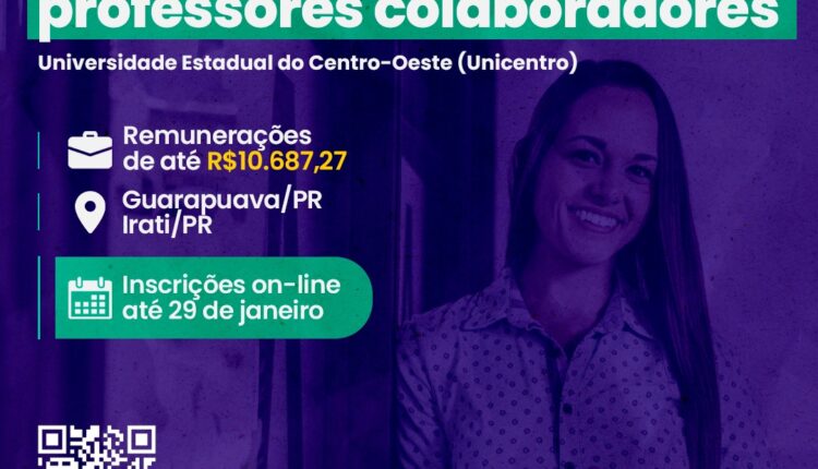 Estão abertas as incrições para o processo seletivo de professores colaboradores da Universidade Estadual do Centro-Oeste (Unicentro), por tempo determinado. A data limite para se inscrever é o dia 29 de janeiro e a prova didática será realizada a partir do dia 25 de fevereiro.