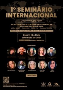 As atividades da programação serão ministradas por profissionais, professores e pesquisadores de universidades brasileiras e internacionais. Com o tema “Estado Democrático de Direito e os desafios na sociedade dos algoritmos: visão Brasil – Colômbia – Espanha – Estados Unidos”, o evento visa debater, por meio de palestras, os impactos das fake news na sociedade e o papel do Estado nesse cenário.