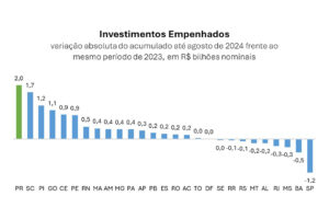 Investimentos em 2024 – Em valores absolutos, os R$ 4,4 bilhões colocam o Paraná como terceiro estado que mais investiu em 2024, atrás apenas de São Paulo (R$ 9,9 bilhões) e Bahia (R$ 5,1 bilhões). Essa mesma posição já havia sido alcançada no levantamento da STN referente ao primeiro semestre.