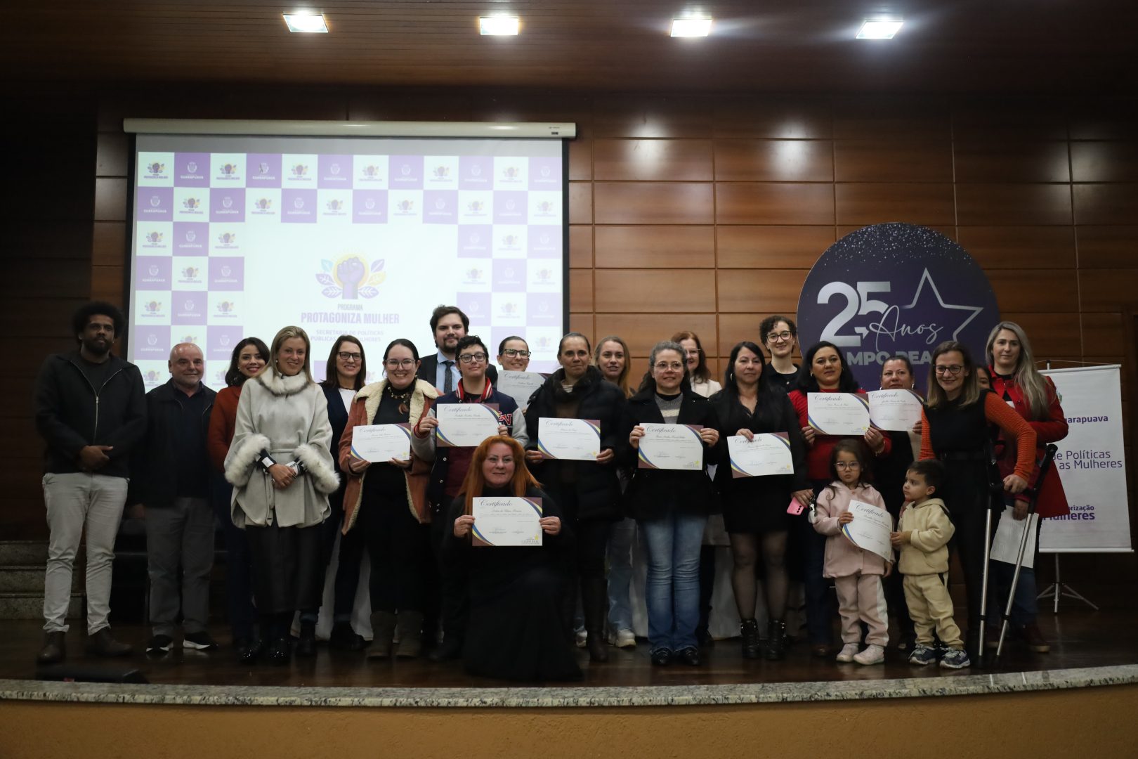 Na noite dessa sexta-feira (27), cerca de 170 mulheres receberam os certificados de conclusão dos cursos ofertados pelo Programa Protagoniza Mulher. A cerimônia foi realizada no Salão Nobre da Faculdade Campo Real e marcou o encerramento de uma etapa de capacitações promovidas pela Prefeitura de Guarapuava, por meio da Secretaria de Políticas Públicas para Mulheres.