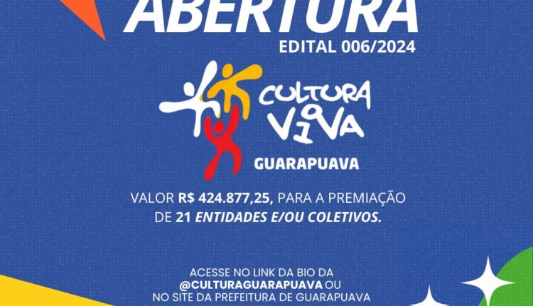 A Prefeitura de Guarapuava, por meio da Secretaria de Cultura (Secult), abriu as inscrições para o Edital 006/2024 de Seleção de Projetos Culturais, baseado na Política Nacional de Cultura Viva (PNCV).