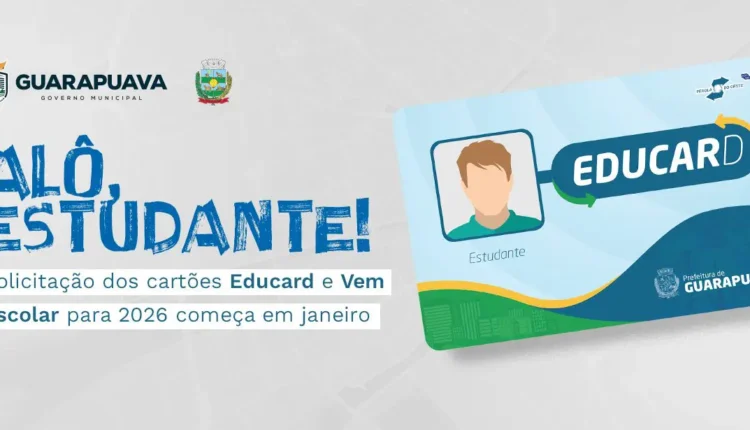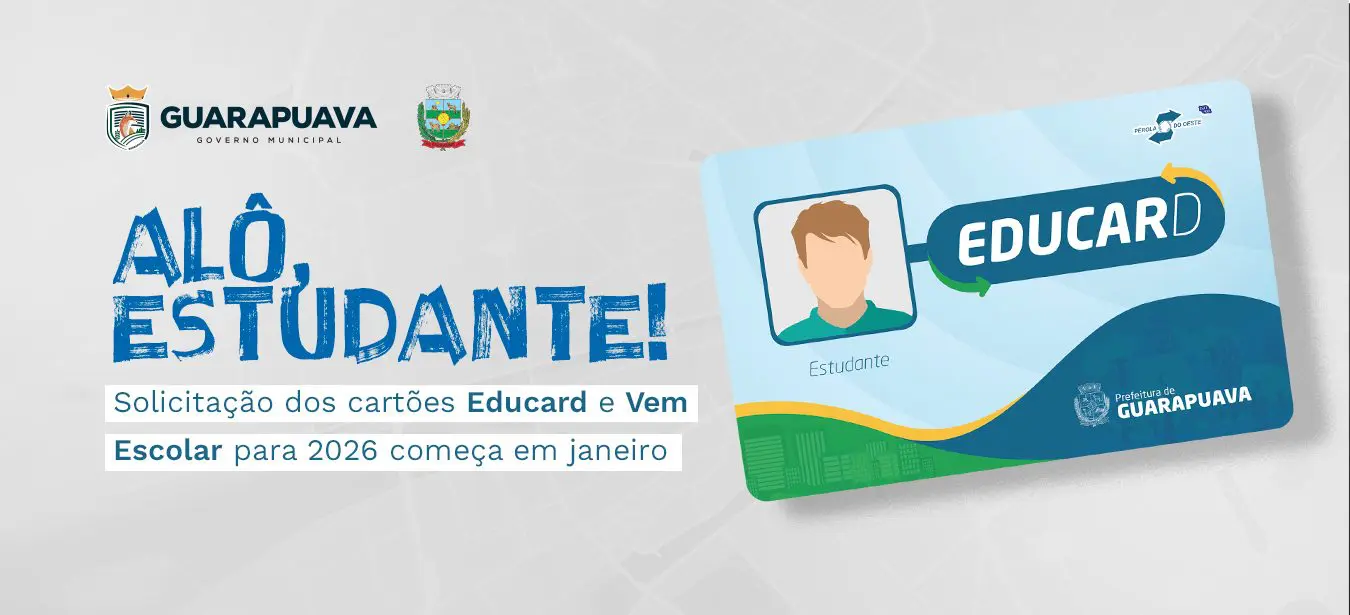 A partir do dia 05 de janeiro, os estudantes de Guarapuava podem solicitar os cartões Educard e Vem Escolar para utilização no ano letivo de 2026. A solicitação deve ser feita exclusivamente pelo Portal do Aluno, disponível no site oficial da empresa Transportes Coletivos Pérola do Oeste. O processo é totalmente digital e inclui o preenchimento de formulário e a atualização dos dados cadastrais.