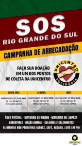 Para auxiliar a população afetada, o Paraná deu início à campanha solidária SOS RS, que vai arrecadar alimentos, água potável, produtos de higiene e limpeza para atender as regiões atingidas. A Unicentro se juntou a essa causa e será um dos pontos para doações nas cidades de Guarapuava e Irati.
