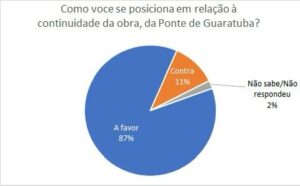 Uma pesquisa contratada pela Associação dos Jornais e Portais do Paraná (ADI-PR) junto ao instituto IRG Pesquisa revela que 88% dos cidadãos do Paraná querem a continuidade das obras da Ponte de Guaratuba. O levantamento foi realizado entre 4 e 7 de outubro e ouviu 1.860 paranaenses. Destes, 1.628 manifestaram-se a favor do seguimento da obra, contrariando decisão judicial que suspendeu os trabalhos.