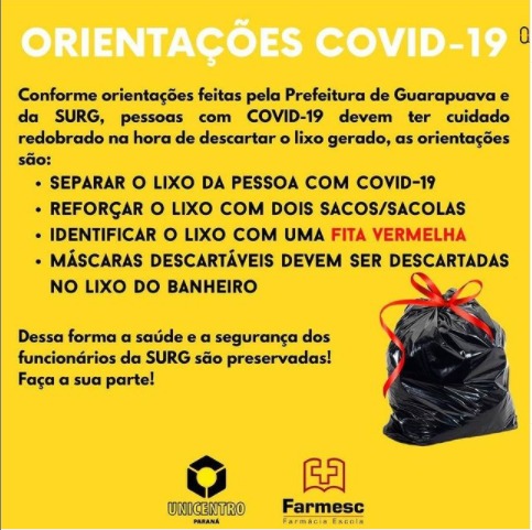 “Pensando-se na saúde e segurança dos funcionários responsáveis pela coleta de lixo da cidade de Guarapuava, os alunos do quinto ano do curso de farmácia da Unicentro, baseados em orientações feitas pela prefeitura e pela Surg, eles elaboraram folders contendo informações sobre o descarte do lixo gerado por pacientes com Covid-19, devido a muitas pessoas não terem acesso às redes sociais.