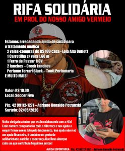 A cada compra de uma camisa, que gira em torno de R$100, R$10 serão destinados ao “Vermeio”, que, em decorrência de uma doença, não está conseguindo trabalhar. Isso por tempo indeterminado. Para realizar o pagamento (que dá direito ao número de uma rifa), basta fazer o Pix para (42) 9 9112-1271. Bora colaborar?