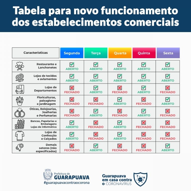 Novo decreto da prefeitura de Guarapuava, divulgado nesse sábado (04), restabelece a abertura de parte do comércio, a partir desta segunda-feira (06).