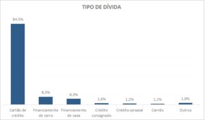 As dívidas se concentram principalmente no cartão de crédito, com 84,5%. Outros motivos para endividamento são o financiamento de veículo (8,3%) e o financiamento imobiliário (6,3%).