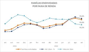 Entre as famílias com renda acima de dez salários mínimos o endividamento caiu de 92,7% em agosto para 92,2% em setembro, porém com elevação no percentual de famílias com contas atrasadas, que aumentou de 16,4% para 17,4%, bem como as que não terão condições de pagar, que passaram de 3% para 4,2% na variação mensal.