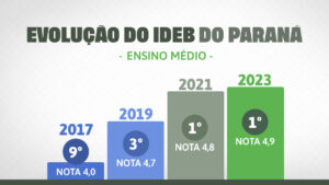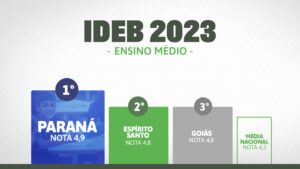 Entre 2021 e 2023, o Paraná aumentou de 4,8 para 4,9 a sua nota no Ideb no ensino médio, o que inclui as escolas públicas, sob gestão do Governo do Estado, e as escolas privadas e institutos federais. Com isso, o Estado manteve a liderança nacional alcançada em 2021, permanecendo à frente de Goiás e do Espírito Santo, ambos com nota 4,8. A média nacional é de 4,3.