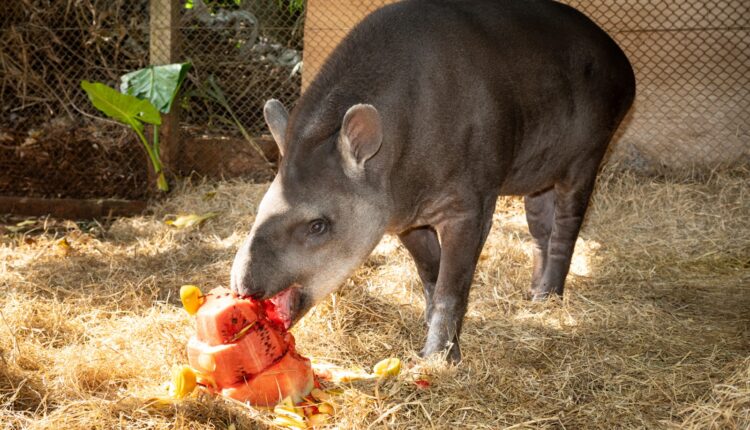 Ela é uma velha conhecida do Refúgio Biológico Bela Vista (RBV) e, nesta terça-feira (19), celebra uma marca rara entre sua espécie: a anta Margarida comemorou 32 anos. Para celebrar a data, ela recebeu um bolo feito com suas frutas preferidas no momento, melancia e maçã.